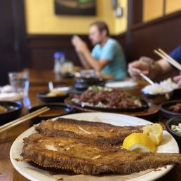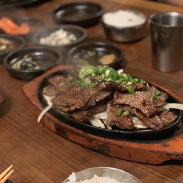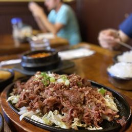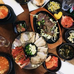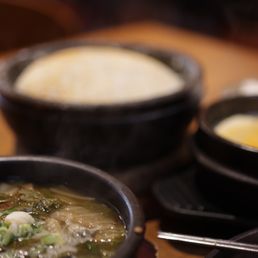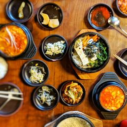 I never thought to come in here until a friend said she was craving Korean food. Looking over the menu, how do you decide what to get, there is a lot to choose from. We had a group of 4, 3 of us had never been here so we completely over ordered. To start we ordered: Kimchi pancake Mung bean pancake Chicken wings: regular and soy garlic Soju cocktail I didn't try the mung bean, but the Kimchi pancake was the perfect balance of crispy outside and soft inside. Those that tried the mung bean pancake also loved it. The chicken wings were very big, our favorite was the soy garlic one. It seemed pricey for wings but there were worth it. Not sure what cocktail we got, but it was delicious. For our mains, a friend and I shared the Del Sot Bi Bim Bop, it came with their original tofu soup The Bi Bim Bop was lacking in flavor, I figured for over $20, it would taste good, but it was a bit disappointing, the savior of the meal was the tofu soup, I had never had tofu soup before and this was amazing!!! It was so good I ordered it the next day for delivery. Pro tip: it's way better in the clay pot when you dine in. The service was great and attentive. They made sure our waters were filled and that we had everything we needed.